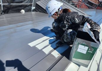 - 現場の進行状況に応じて下地調整・養生・塗装・清掃などの様々な仕事を行います。チームで協力・分担して進めていきます。写真は屋根を塗装している様子です。