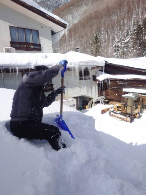 旅館で雪下ろしをしている様子。